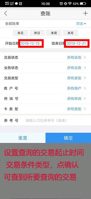 3.在此頁面設置要查詢交易的起止時間,或者其他交易條件類型,點“確認”后即可查到所要查詢的交易